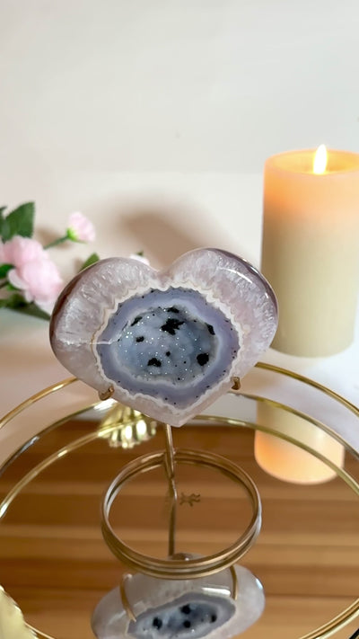 Ce cœur en agate bleue nuancée se distingue par un cercle naturel doré qui vient enlacer son centre, comme une couronne minérale formée par le temps.