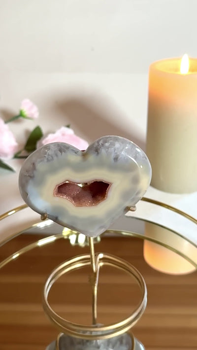 Ce cœur en agate dévoile une palette subtile de nuances lactées et sable chaud, traversées par un portail naturel aux reflets cuivrés. En son centre, la matière s’ouvre, comme une respiration, révélant une profondeur minérale vivante et magnétique.